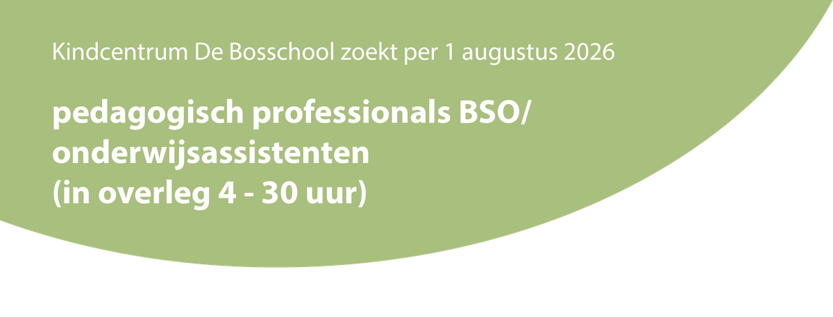 Op Kindcentrum De Bosschool vinden we een brede ontwikkeling van kinderen belangrijk, en daar kun je niet vroeg genoeg mee beginnen. Daarom kunnen kinderen van 4 tot 13 jaar bij ons kindcentrum terecht voor onderwijs, opvang en ondersteuning die aansluiten bij hun ontwikkeling. Jezelf ontwikkelen lukt het beste in een veilige en positieve omgeving waar kinderen durven te zijn wie ze willen zijn. Wij werken aan een stevige basis voor alle kinderen. Door spelenderwijs kennis te maken met de omgeving, wordt hun wereld steeds een beetje groter. Daarnaast speelt expressie op de Bosschool een belangrijke rol. Binnen ons kindcentrum is er een vloeiende overgang tussen onderwijs en naschoolse opvang. Wij werken vanuit één multidisciplinair team met één pedagogische visie, waarbij het kind centraal staat. We zoeken collega's die zich helemaal in onze visie kunnen vinden, willen meehelpen onze nieuwe BSO vorm te geven en/of ondersteuning in de klas willen geven. We gaan graag met jou in gesprek om te kijken wat we voor elkaar kunnen betekenen. We zijn benieuwd naar jouw ideeën!